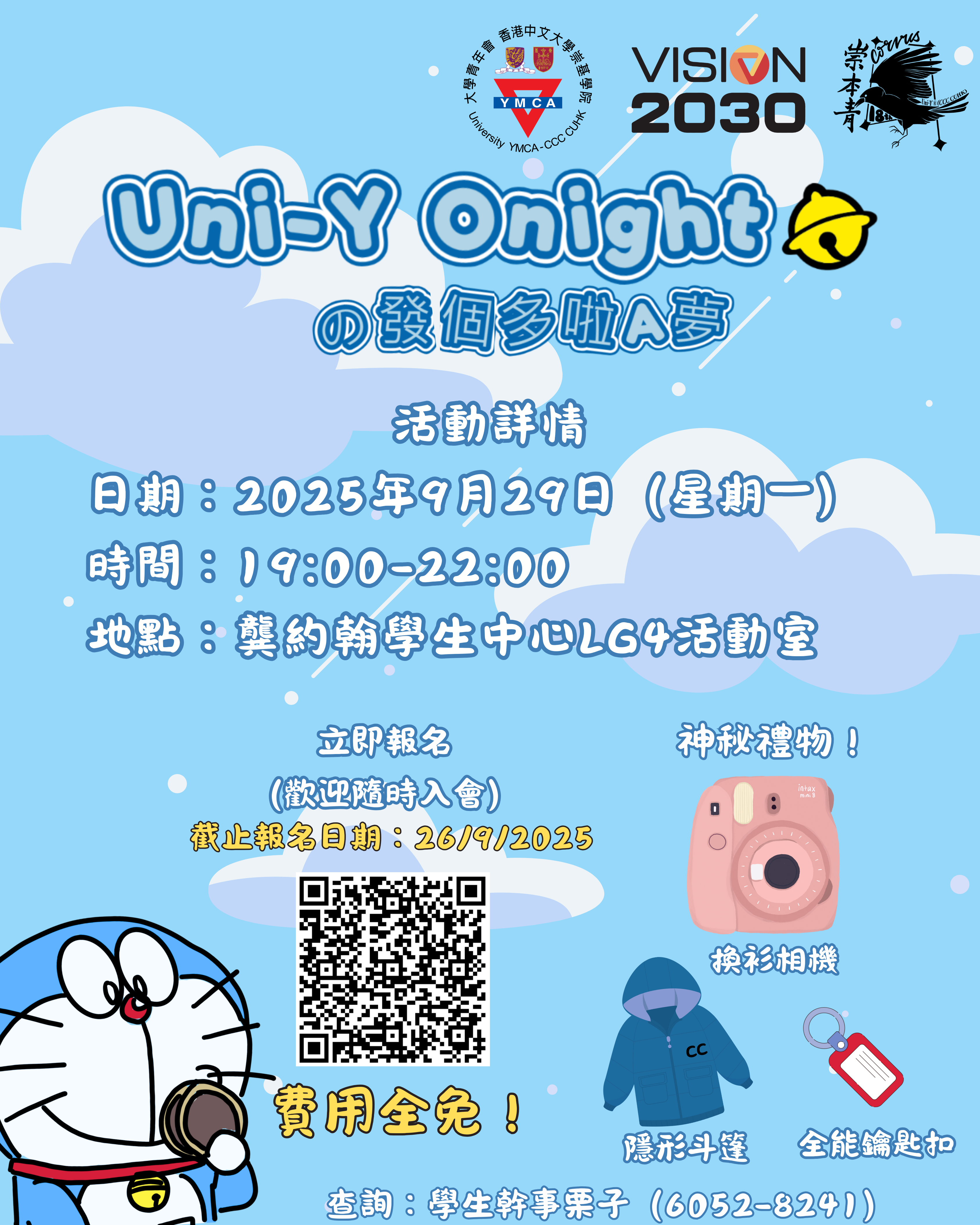Do you dream of trying Doraemon’s gadgets? If yes, don’t miss the opportunity to join “Doraemon’s Dream in UNI-Y ”. The University YMCA (CCC CUHK) will be hosting O-Night on September 29th (Mon). You will meet other Chung Chi friends, play games, know more about Doraemon’s magical gadgets, and even get a chance to win them! Most importantly, you will learn more about Uni-Y! Here are the details of the O-Night: