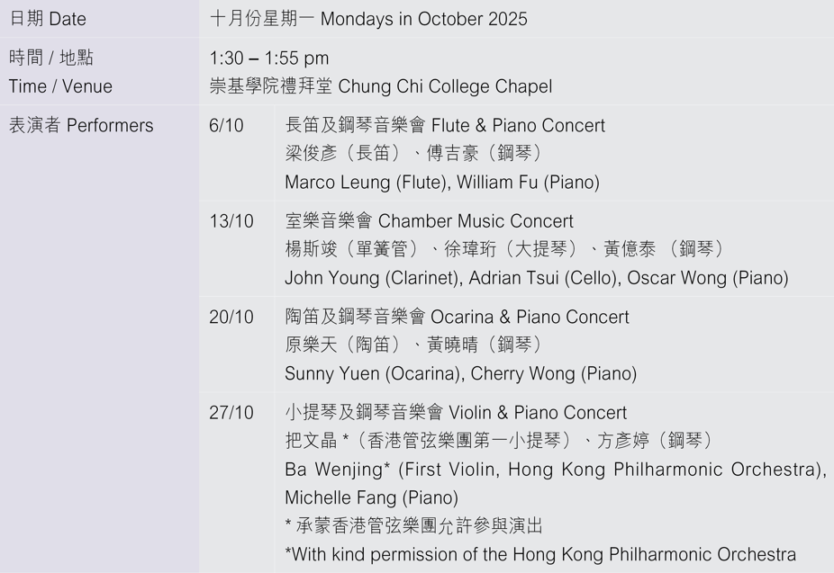 校牧室將舉辦「午間心靈綠洲」,為校園內埋首於知識寶庫的老師、同學及各部門公務繁重的職員提供一片可以使心靈得蒙滋潤的綠洲。活動費用全免,歡迎一同聆聽洗滌心靈的合唱音樂及器樂作品,讓音樂沉澱思緒、滌蕩心靈,重新得力。