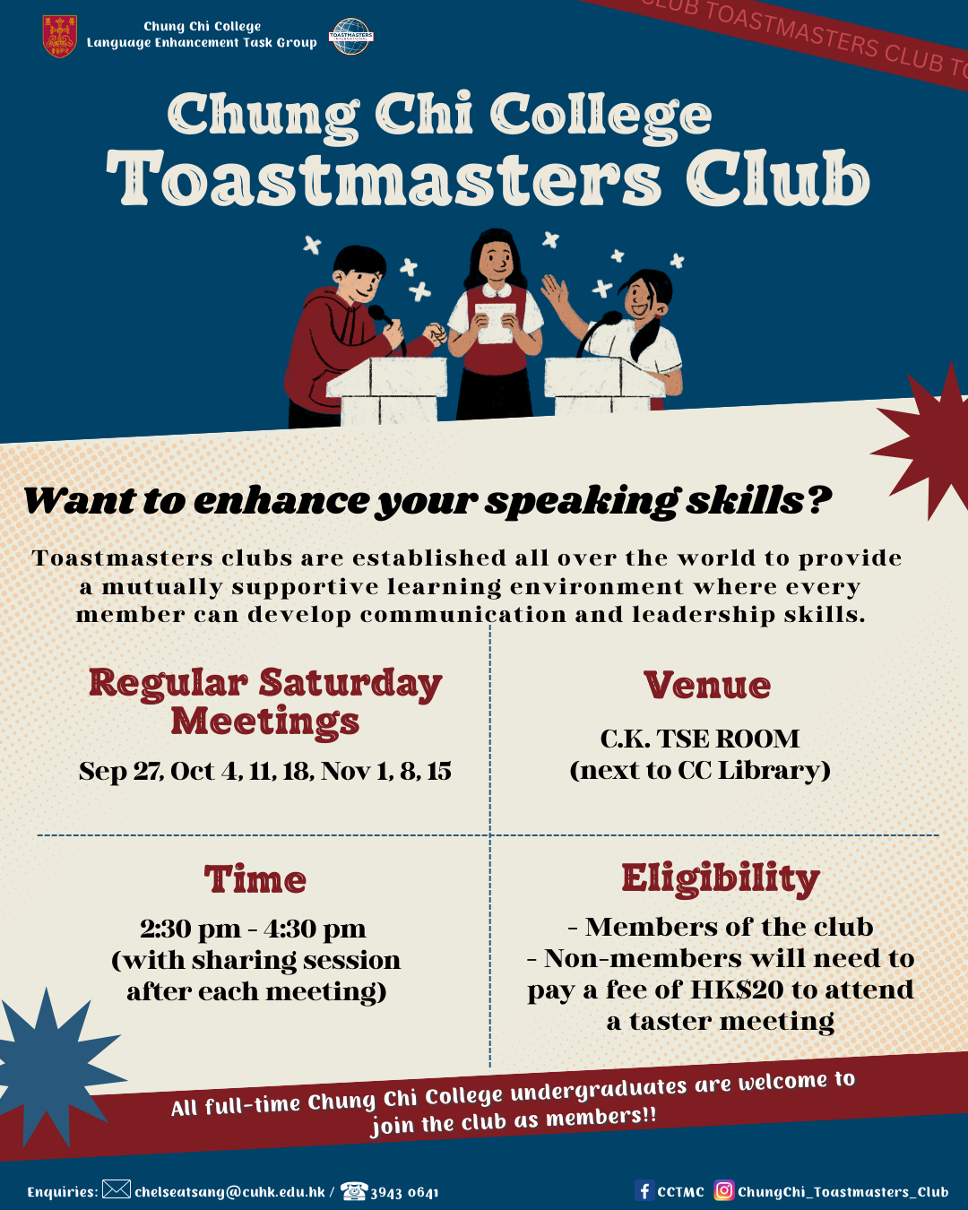 The Chung Chi College Toastmasters Club aims to polish Chung Chi students’ public speaking skills and boost their confidence. The impromptu speeches and evaluation sessions in every weekly club meeting enhance members’ organizational skills and ability to respond to unexpected occasions.